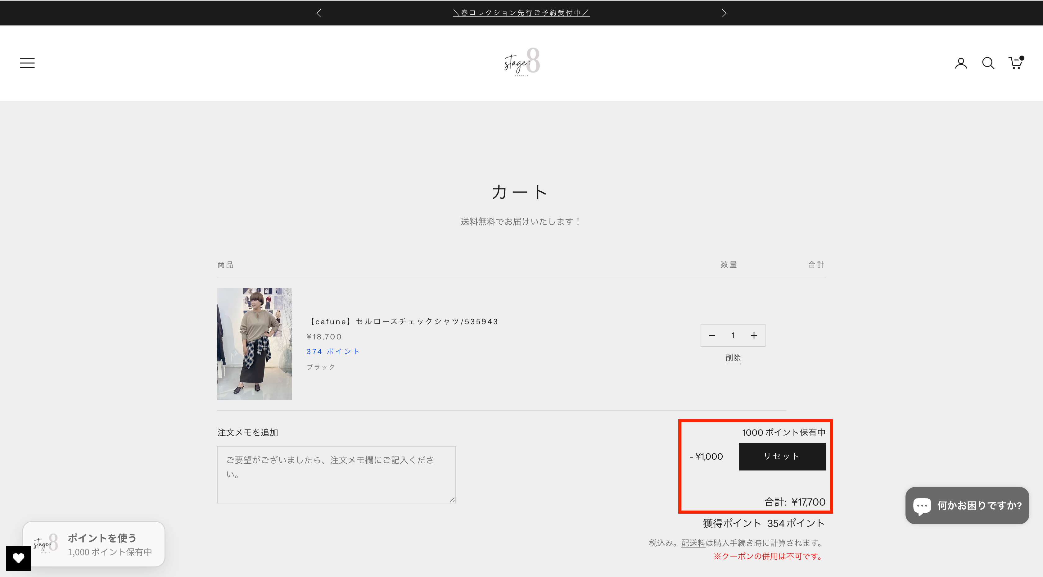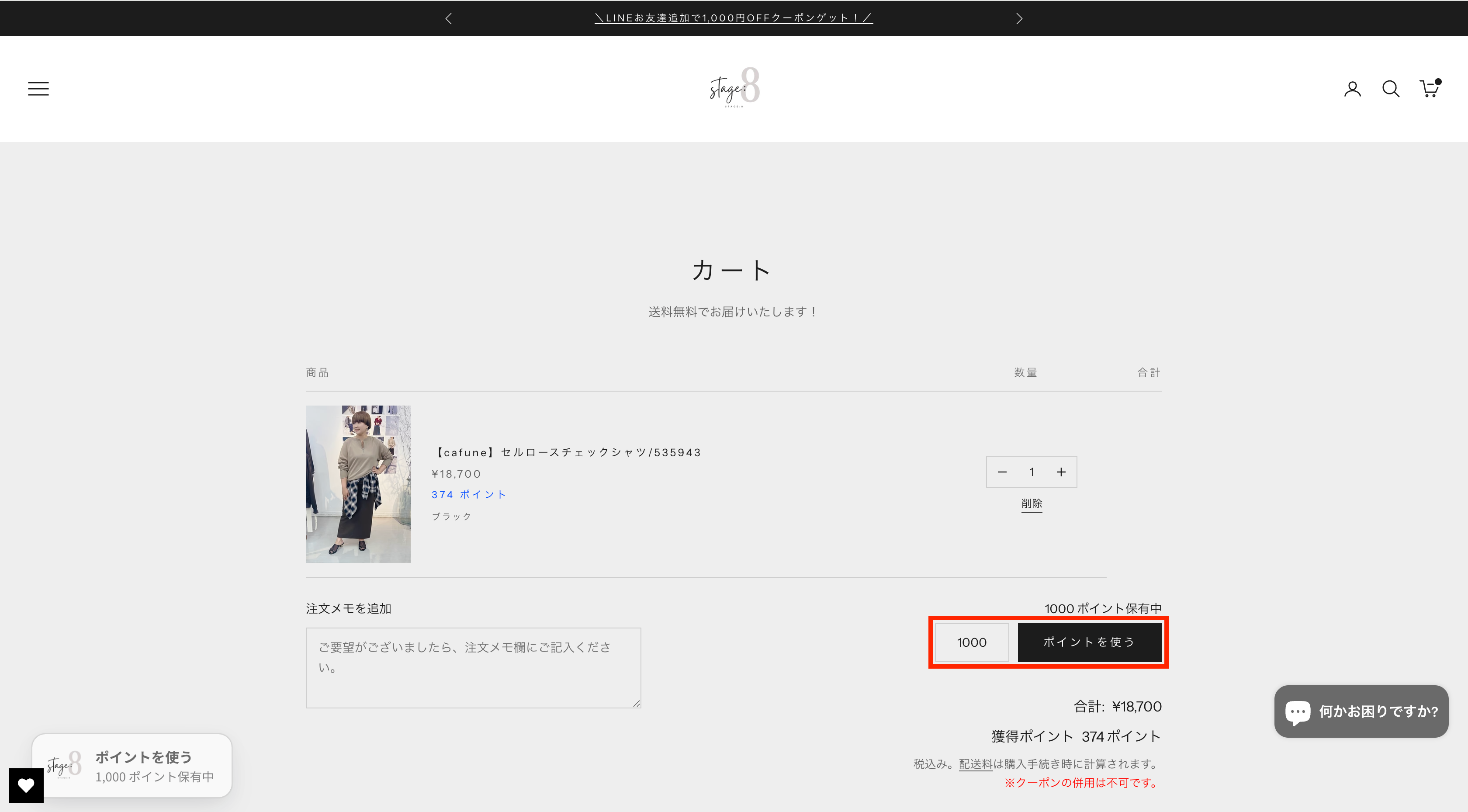 ②カートへ移動し、使用したいポイント数を入力の上、「ポイントを使う」をクリックします。