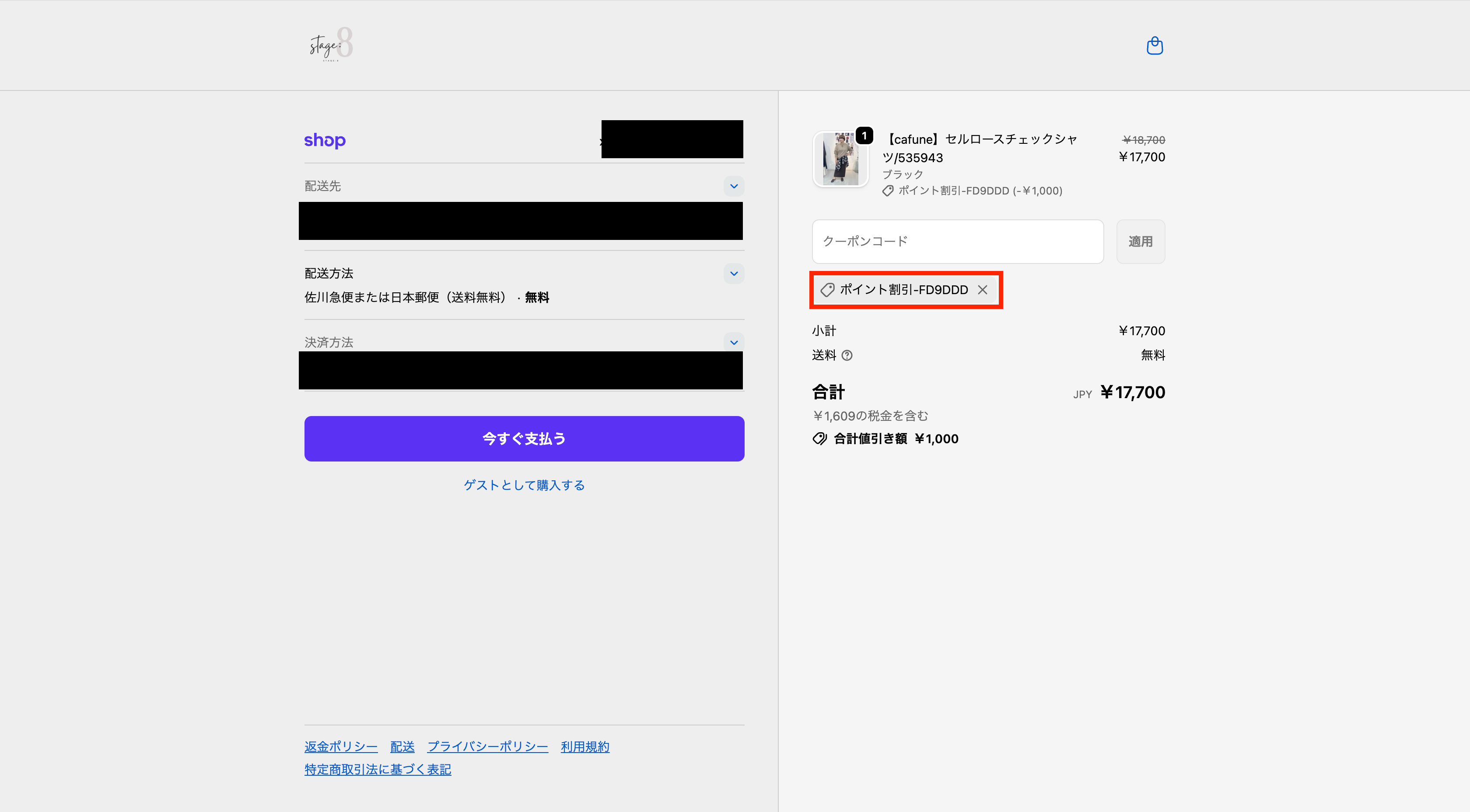 ④ポイント割引のクーポンが作成されていることをご確認の上、配送方法の選択、決済を完了してください。