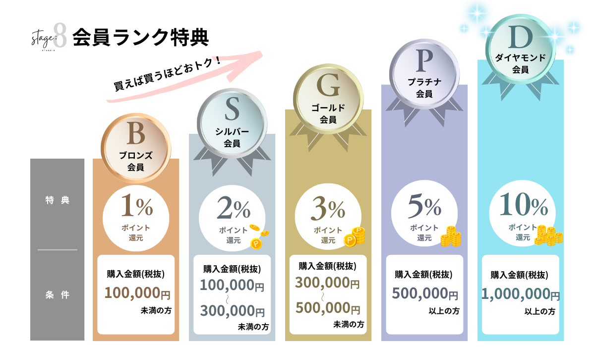 会員ランクが上がると、1回のお買い物で貰えるポイント還元率もアップ。「1ポイント=1円」として、1ポイントから店舗とオンラインストアでご利用いただけます。ランクに応じた特典やサービスもご用意しています。毎年3月1日に、直前の1年間(前年3月1日~2月末)のご購入金額合算でランクが決定します。3月1日に決定したステージは、翌年の2月末まで下がることはありません。