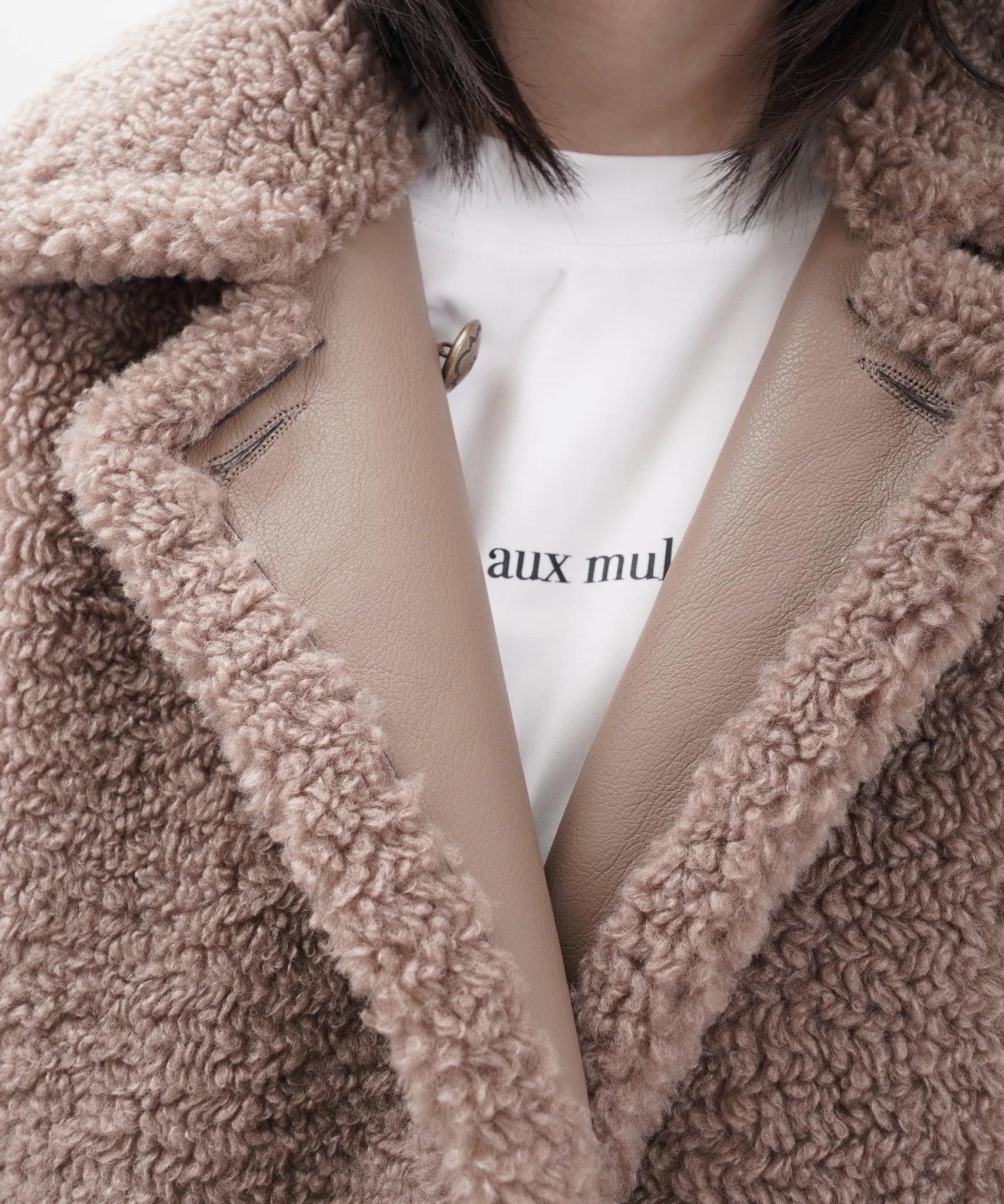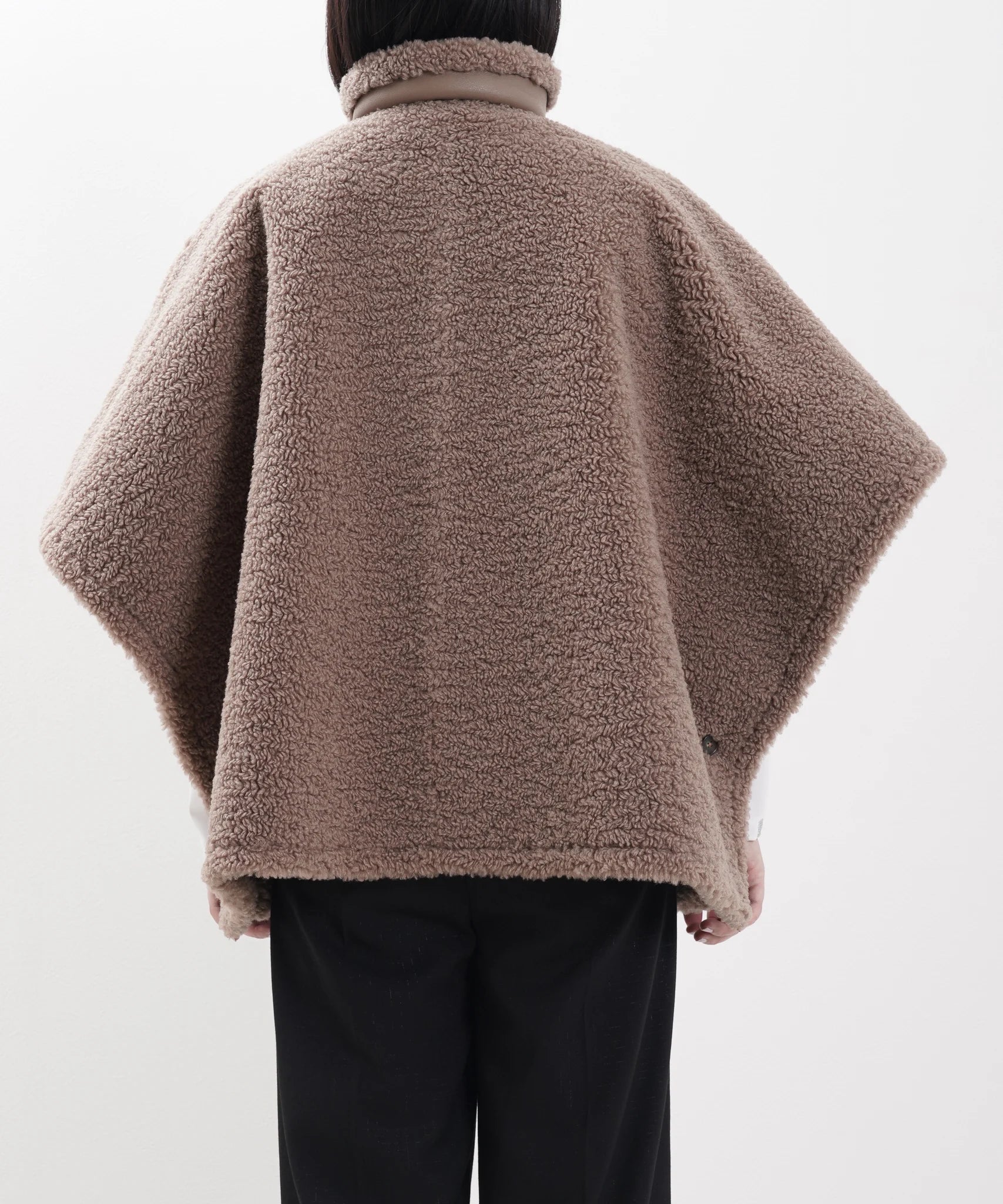 レザー面とボア面、リバーシブルでご着用いただけるエコムートンポンチョ。レザー面のボタンはコンチョ釦で、ボア面はスコッチ釦にしてそれぞれの顔が際立つようにしました。裏表で印象の変化を楽しめる商品です。
